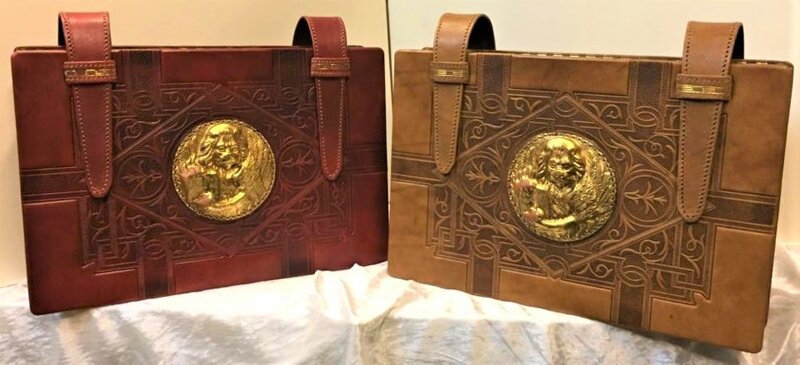 Piena pelle di vitello di prima qualità stampata con grande cliché del 1880,leone in pelle dorata cucito sul fronte, tessuto del soffietto nero "macchiato" in oro a caldo..
