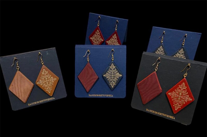 Orecchini in pelle stampata oro,tessuto moerro sul retro.
